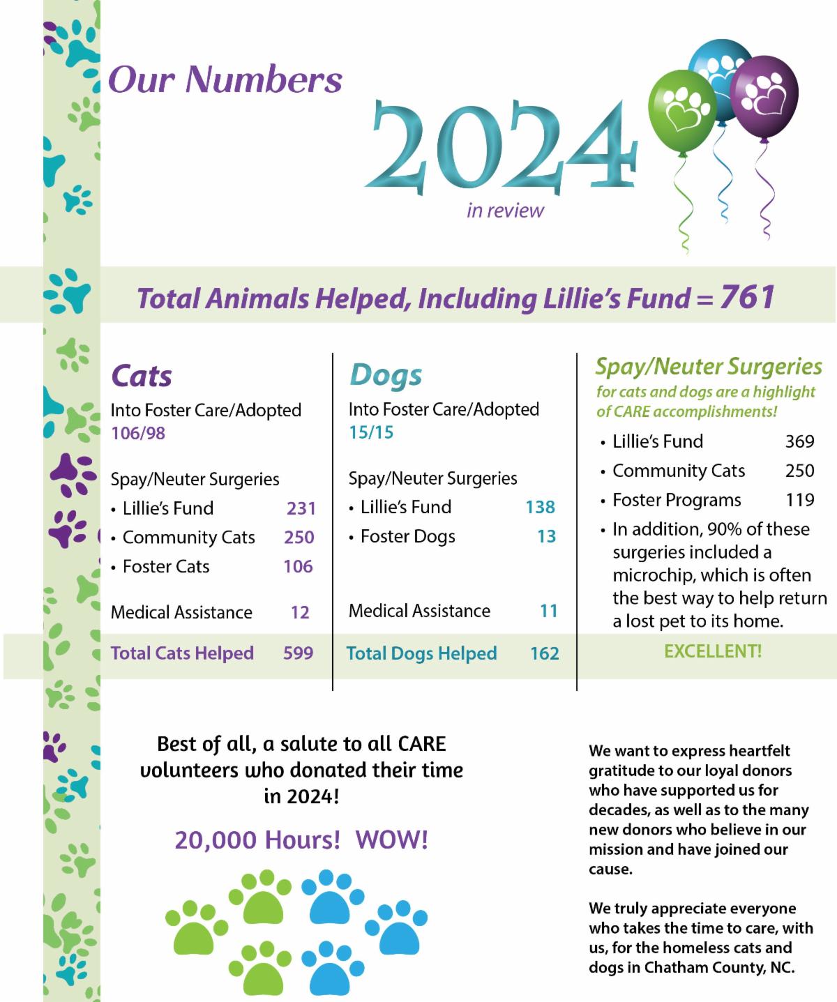 The lives of 738 cats and dogs in need in Chatham County are better because you care. From beginning to end, you - our volunteers, our foster caregivers, our donors --you each made many lives better.