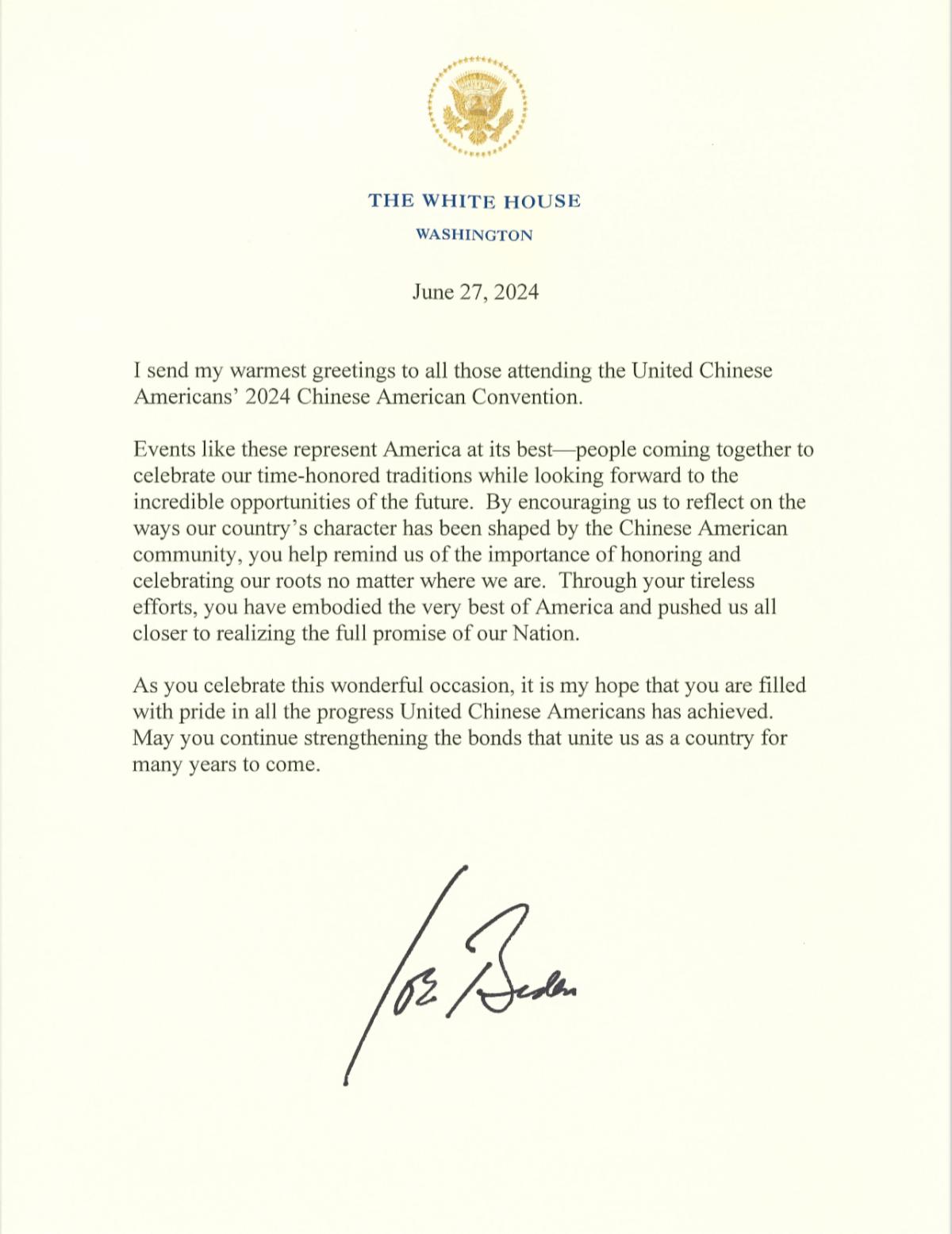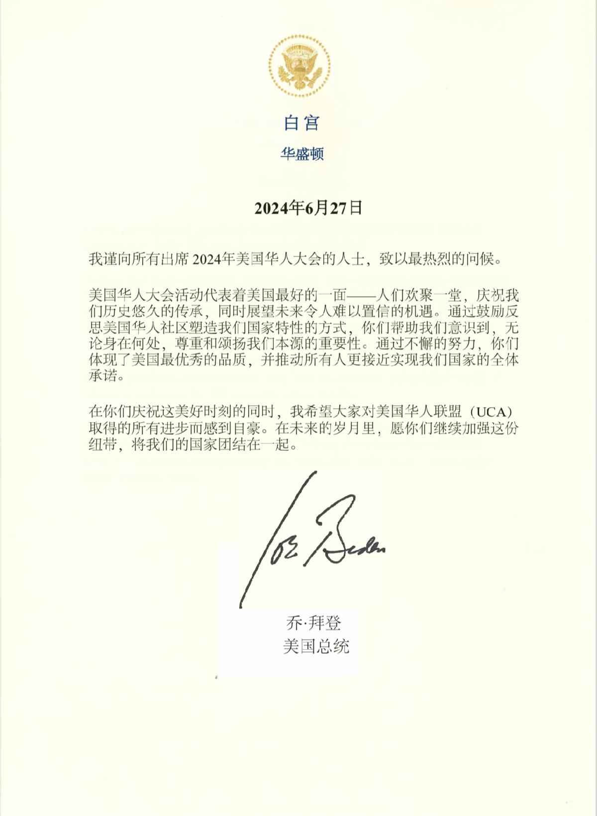 拜登总统贺信 I 预祝2024第四届美国华人大会成功召开 | |
