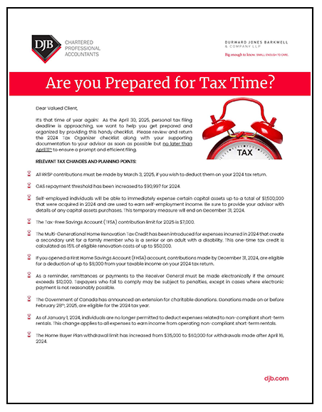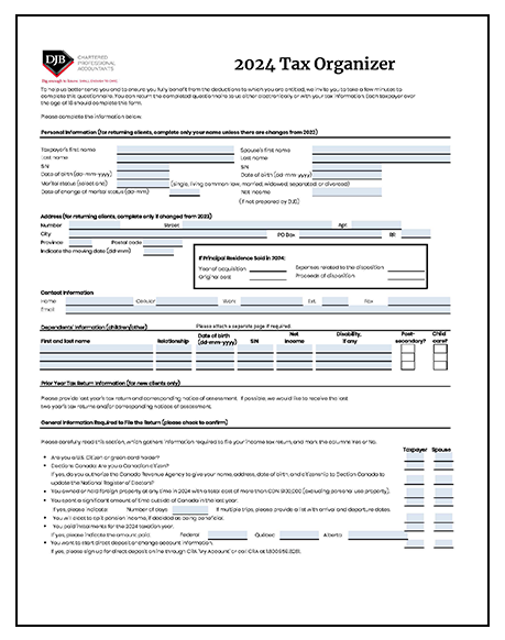 It’s that time of year again! As the April 30, 2025, personal tax filing deadline is approaching, we want to help you get prepared and organized by providing this handy checklist. Please review and return the 2024 Tax Organizer checklist along with your supporting documentation to your advisor as soon as possible but no later than April 11th to ensure a prompt and efficient filing.