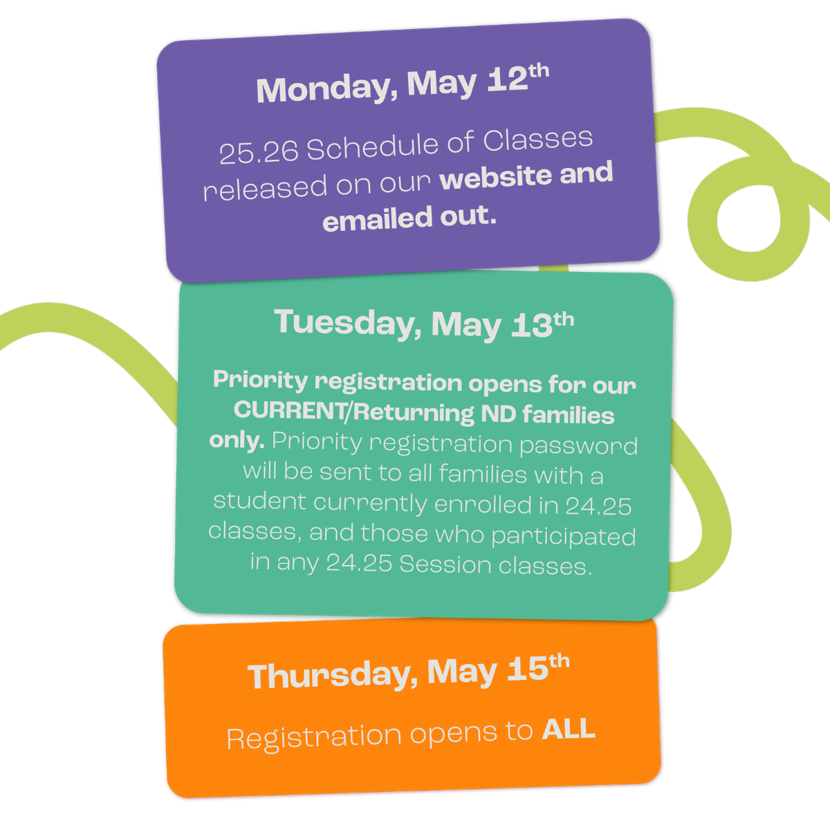NEW THIS YEAR, we will opening registration for 25.26 classes in May!
