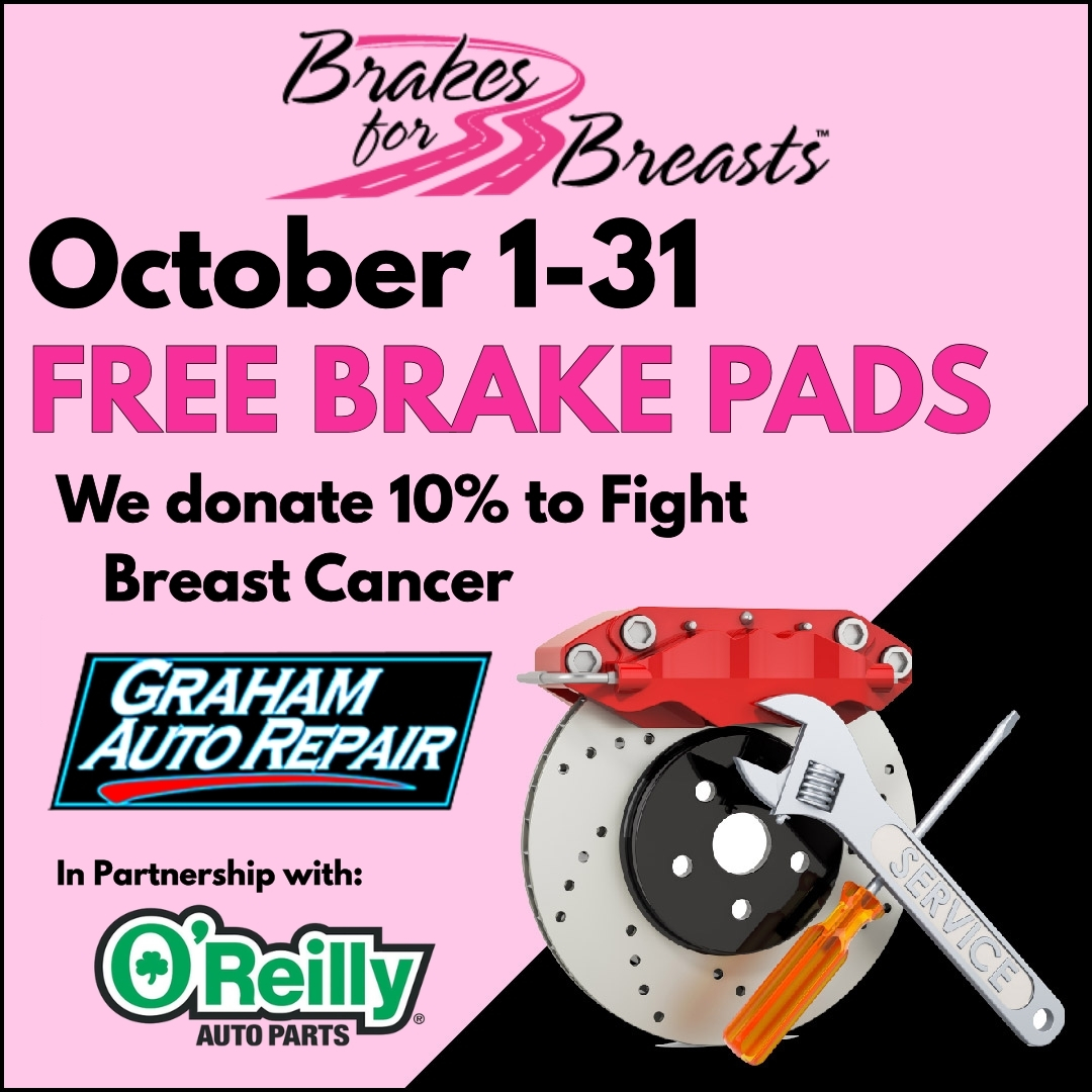 Throughout the month of October, NWACA member Graham Auto Repair is once again joining the fight against breast cancer with its annual Brakes for Breasts fundraiser. From October 1–31, 2025, customers who schedule a qualifying brake service will receive free premium-quality brake pads, paying only for labor and any additional parts, while Graham Auto Repair donates 10% of every brake service to support breast cancer research.