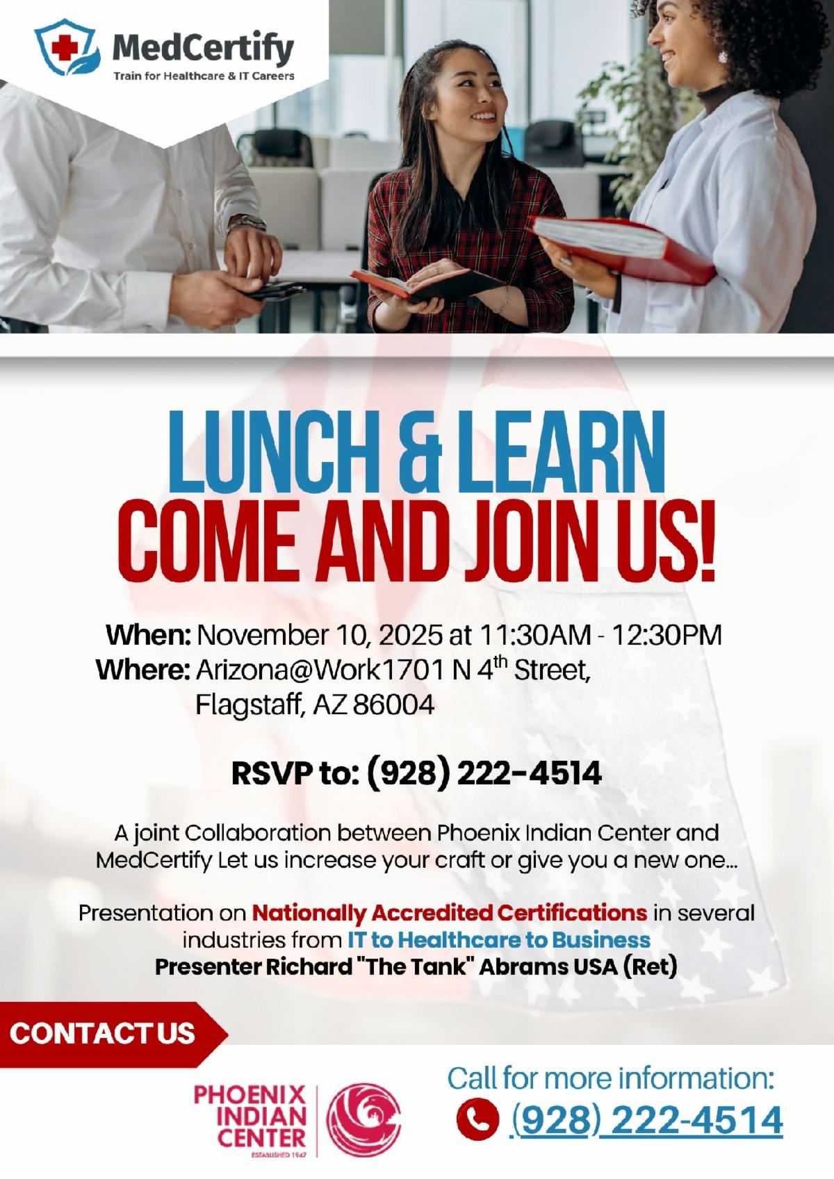 Our community partner, Phoenix Indian Center, will host a Lunch and Learn with MedCertify on Monday, November 10, at 11:30 a.m. The event will take place at the ARIZONA@WORK One-Stop Center, 1704 N. Fourth St., Flagstaff, AZ 86004.