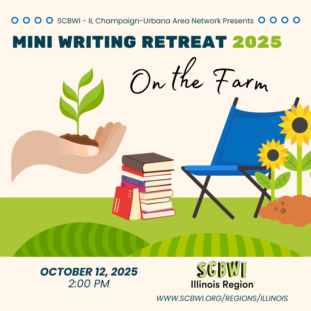 It’s back – the Mini Writing Retreat on the Farm! We had a great time last year and our hosts have graciously agreed to host again on their farmstead in Northeast Urbana. We'll gather in this relaxed setting for conversation, connection, and reflection. Bring your favorite unplugged writing tools, a book that has had meaning to you this year, and your willingness to try new things. Bring a snack to share if you wish. We’ll be outdoors unless inclement weather sends us inside. Please rsvp to central.illinois.scbwi@gmail.com by Sunday, October 5th so we can plan for you! Driving directions will be shared the week before the program.