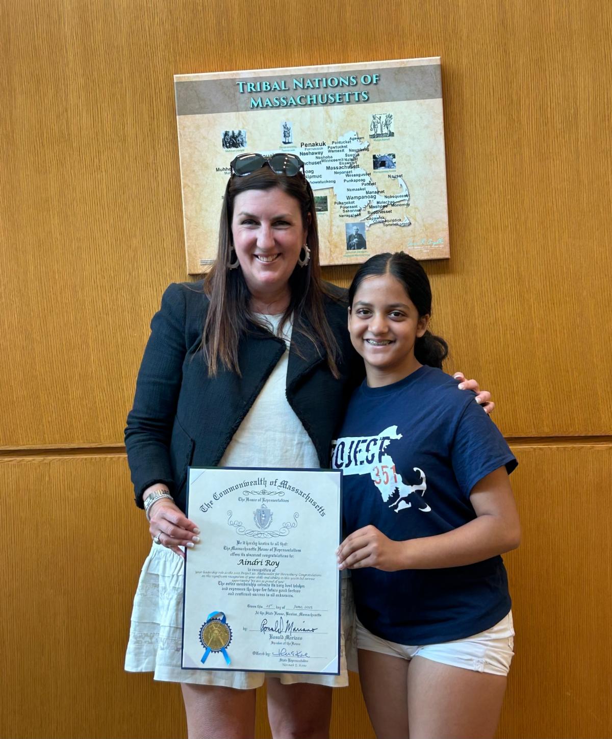 | | Project 351: This summer, I presented a citation to Aindri Roy, Shrewsbury’s 2025 Project 351 Ambassador. All 351 cities and towns have an Ambassador chosen by local educators to participate in a year long, youth-led service opportunity across the Commonwealth. Aindri is a freshman who started her service in January and has already made an incredible impact. Project 351 is an amazing organization that has supported more than 5K youth since 2011 in making positive change and cultivating a new generation of leaders. | | |