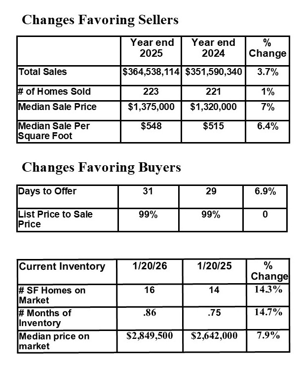 What is happening in the local real estate market? 2025 was another good year for the local real estate market and better than the previous year. Number of homes sold, total sales and median sale price are all up slightly from 2024. While we have seen a sellers market for the past few years, we are now moving into a more balanced market, which favors neither buyers nor sellers.