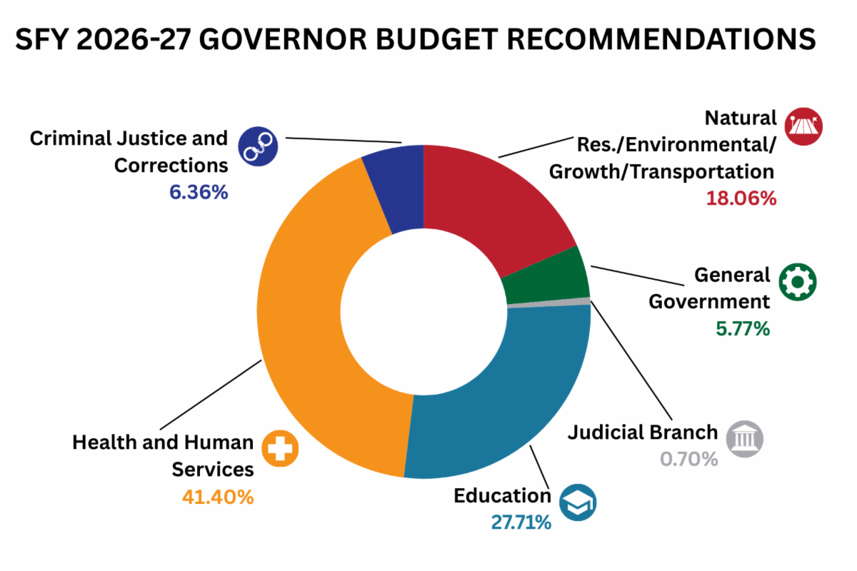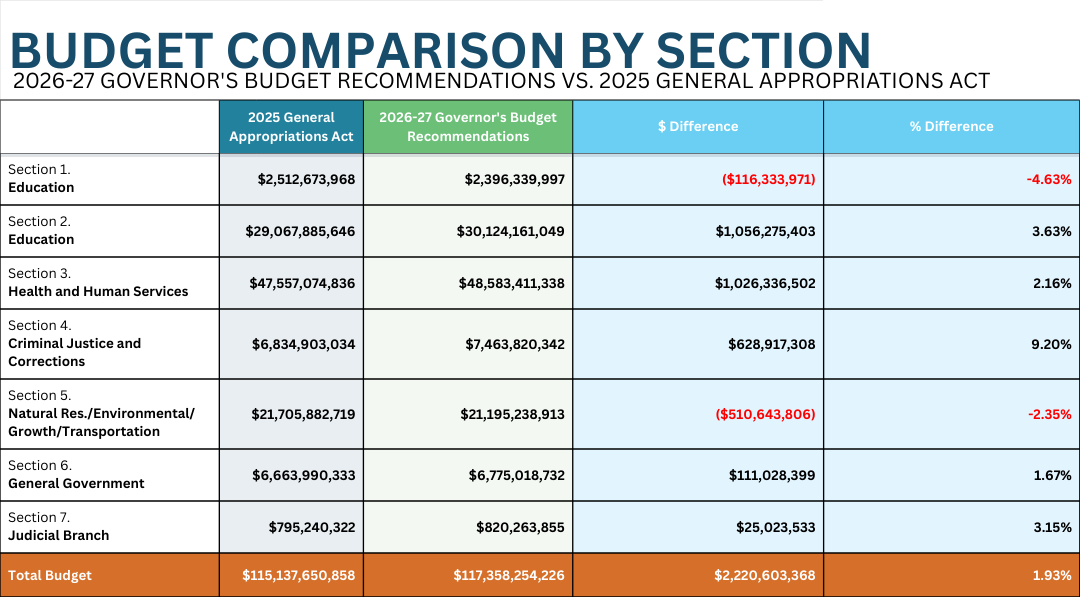 The Governor’s Budget Recommendations for SFY 2026-27 total approximately $117.4 billion, which represents a 1.93% increase from the 2025 General Appropriations Act, the current state budget for SFY 2025-26.