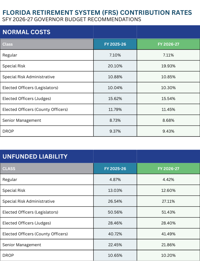 The Governor’s Budget Recommendation include fully funding the required contributions for Florida Retirement System (FRS) employers to ensure the long-term solvency of retirement benefits for state employees, including law enforcement officers and teachers. Please see below for a comparison of the FY 2025-26 contribution rates along with the Governor’s recommended changes: