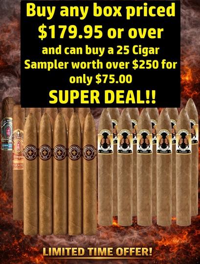 This sale we have a SUPER DEAL ....buy any box of Cigars that sells for $179.95 or over and you can buy a Great 25 Cigar Assortment worth over $250 for only $75!!