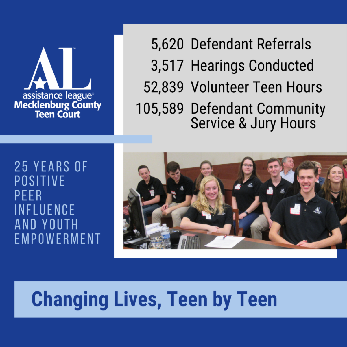 Mecklenburg County Teen Court (MCTC) is proud to celebrate the 25th anniversary of its founding. It began with a small but determined group of Assistance League members. No one had a legal background, but they gathered a wealth of knowledgeable, experienced and professional juvenile advocates around them to form an Advisory Council to provide an alternative justice system for juveniles aged 10-15 in the Charlotte community.