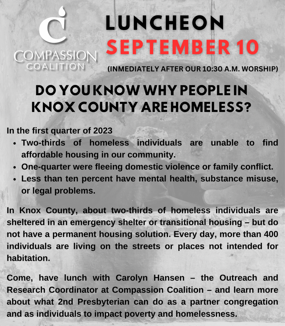 Please get in touch with the Church Office with prayer concerns to be listed in the weekly email or bulletin (mvillalta@2ndpres.org, 865.523.2189)