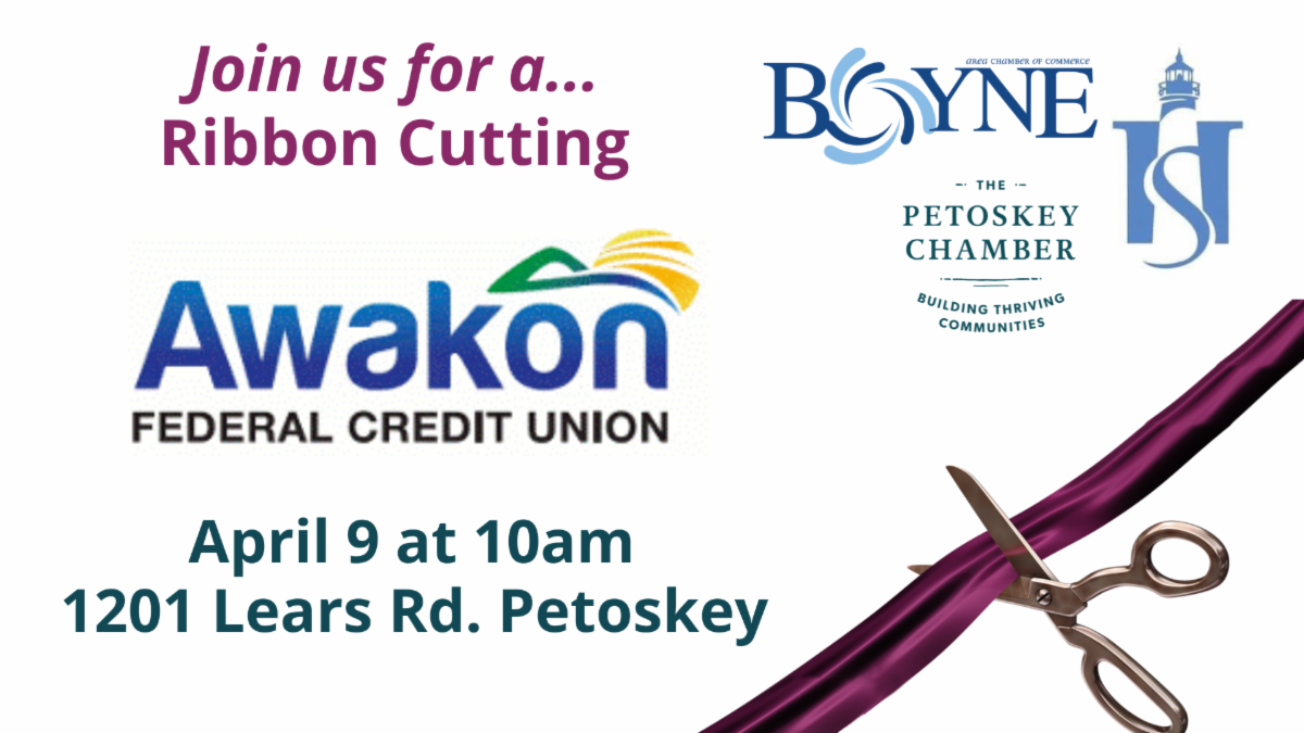 | | See You at These Upcoming Ribbon Cuttings | | Please join us for a ribbon-cutting ceremony to celebrate new Harbor Springs Chamber of Commerce member, AcuTwin LLC. We will plan to meet at the Chamber office (118 E. Main St., Harbor Springs) during Coffee & Conversations on Tuesday, April 1st. The ribbon-cutting will be held at 8:30 am. This is a great time to gather, enjoy a cup of coffee, meet new people, and learn more about AcuTwin LLC. | | Please join us in celebrating a new member, Up North Tanning, with a Ribbon ribbon-cutting celebration on Wednesday, April 2, 2025, at 9:00 am. The celebration will be held at Up North Tanning located at 2264 M-119 Suite 2A, Petoskey in the Clock Tower Plaza. We look forward to seeing you there to celebrate and take a tour. | Join the Boyne Area Chamber, Harbor Springs Area Chamber and Petoskey Regional Chamber for a ribbon cutting for Awakon Federal Credit Union to celebrate the opening of their new branch at 1201 Lears Road, Petoskey (located inside Meijer) on Wednesday, April 9 at 10am. An open house will follow from 10am until noon. Stop in to see the new location, enjoy coffee and pastries and giveaways. The branch is now open from 10am-6pm Monday-Friday and 10am-4pm on Saturday. | | Airport After Hours May 1 - Win a $500 Delta Gift Card! | |
