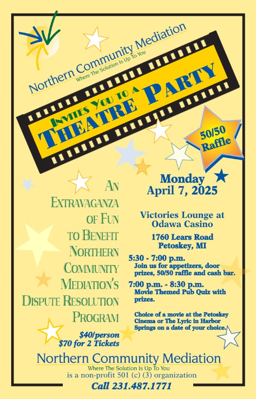 Northern Community Mediation (NCM) is holding its annual Petoskey-Harbor Springs Theatre Party on Monday, April 7 at Victories Lounge at Odawa Casino. This is going to be one fantastic party with appetizers, door prizes, a 50/50 raffle and a cash bar- all of it for the low price of just $40 per ticket or two tickets for $70.