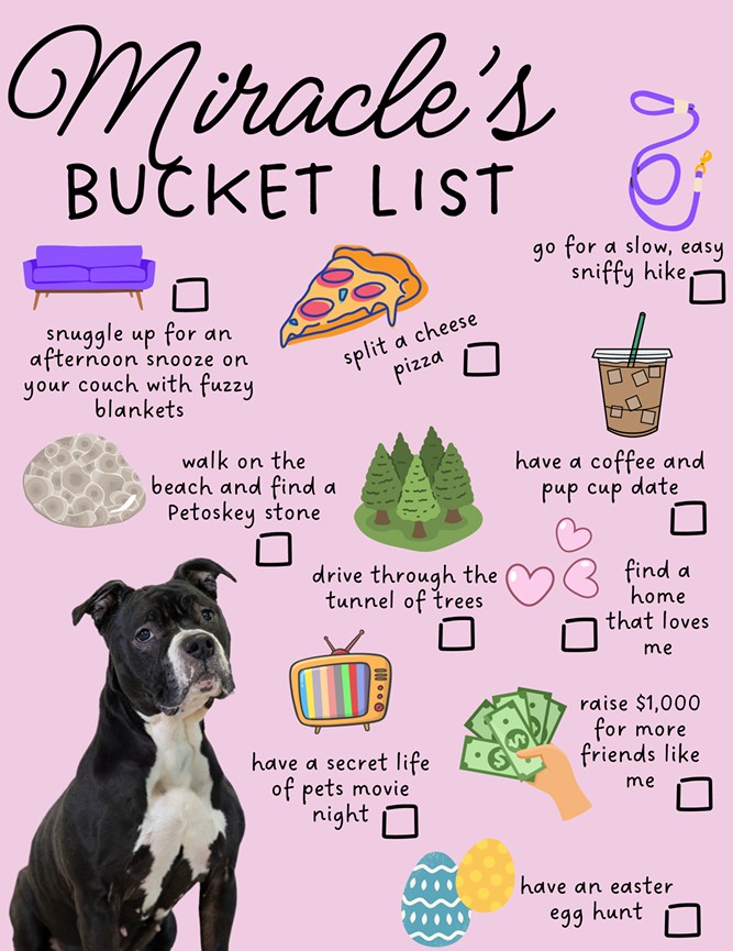 Meet Miracle, a sweet dog with a heart full of love, who recently arrived at Little Traverse Bay Humane Society (LTBHS). Though she’s been diagnosed with lymphoma, her story isn’t over yet! LTBHS has created Miracle’s Bucket List, a series of special experiences to fill her remaining time with joy—including a pup cup, a scenic ride, and even her own Easter egg hunt!