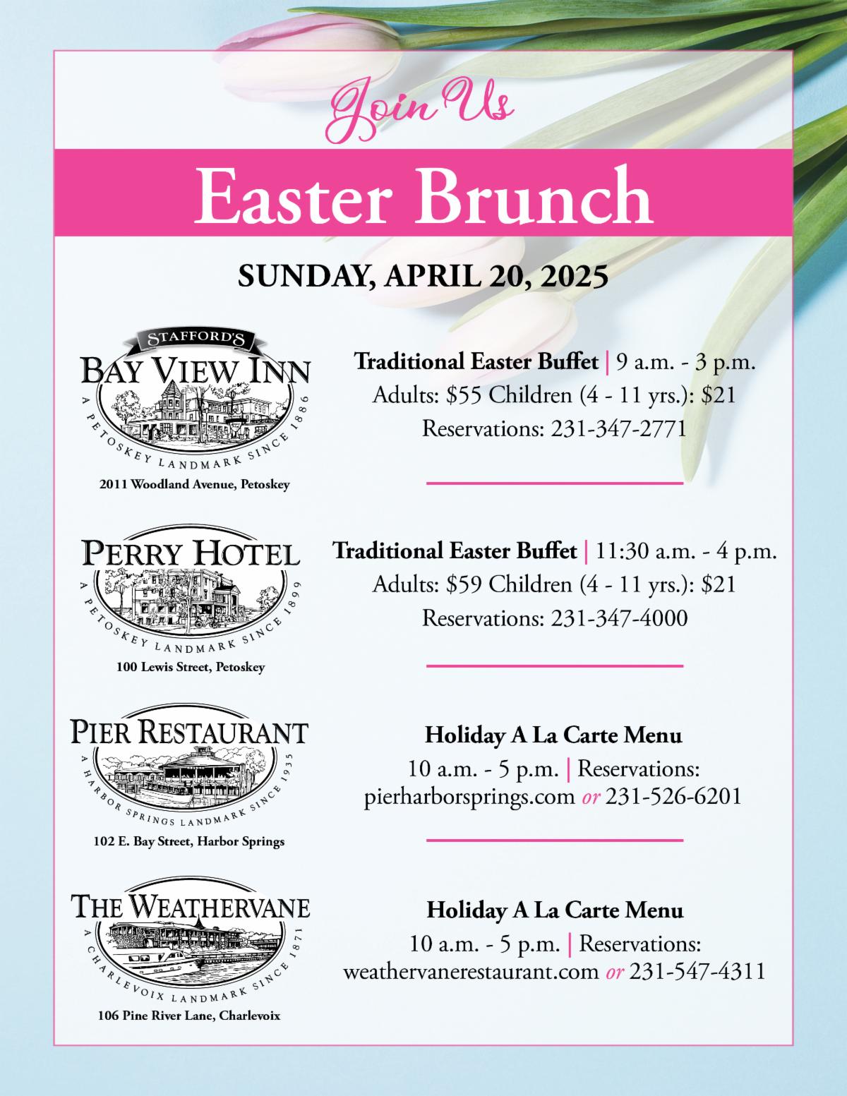 Perry Hotel – Buffet from 11:30 AM - 4 PM ($59 adults, $21 kids) | Reservations: 231-347-4000