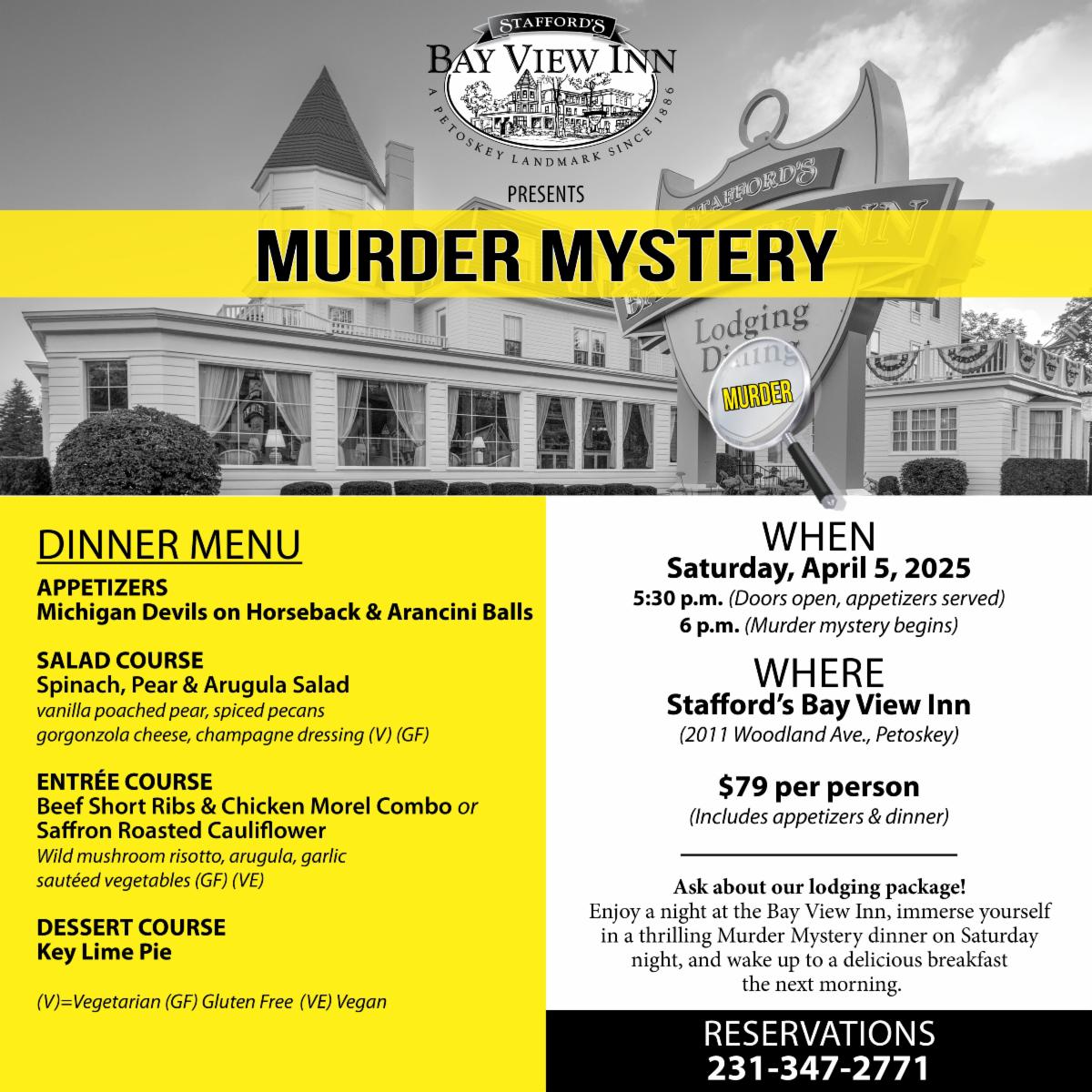 | | Four Course Meal To Die For | | Stafford's Bay View Inn Murder Mystery - A Killer Dining Event! Includes a 4 course dinner and a mystery. Saturday, April 5 Doors Open 5:30 PM Mystery Event starts at 6 PM. Reservations 231-347-2771 | |