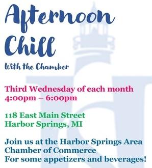 The Harbor Springs Chamber will host our next Afternoon Chill event from 4 to 6 p.m. Wednesday, March 20, at the Chamber office. Afternoon Chill is held on the third Wednesday of each month with drinks, appetizers and conversation. No RSVP is needed.