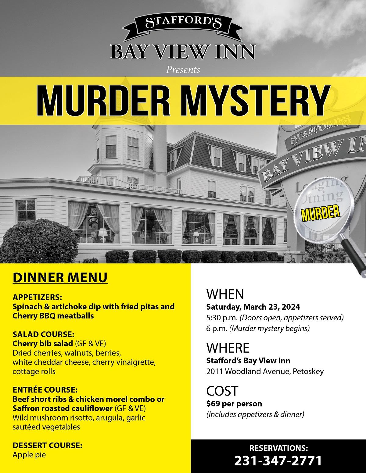 Stafford's Bay View Inn will host a Murder Mystery dinner and performance on Saturday, March 23rd. Call 231-347-2771 for reservations. Flier with details and menu.