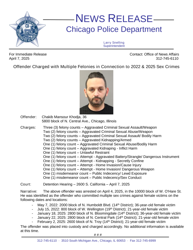 CPD has issued the following charges against Chakib Mansour Khodja in connection with multiple sex crimes committed in 2022 through 2025. The 14th District held an outdoor rollcall last month and discussed the concern about the attacks in the media to draw attention to the incidents. Detectives were able to use recent video surveillance and DNA evidence to connect Khodja to the crimes. | | |