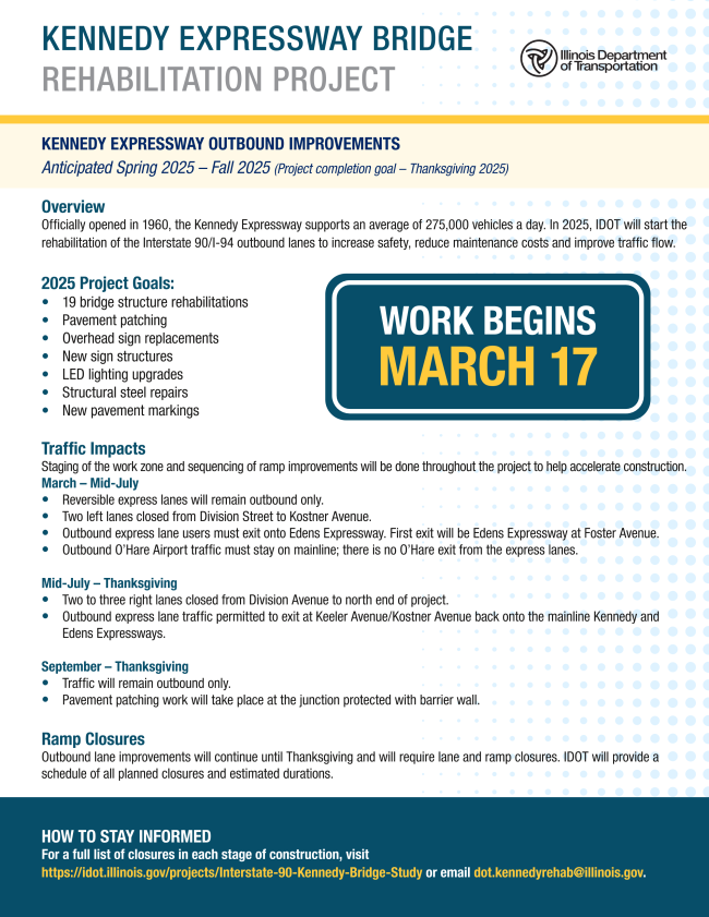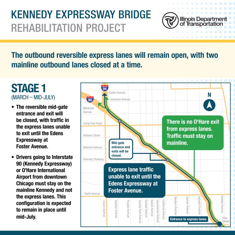 In 2023, IDOT began rehabilitating the Kennedy Expressway (Interstate 90/94), from the Edens Expressway (I-94) junction to Ohio Street.