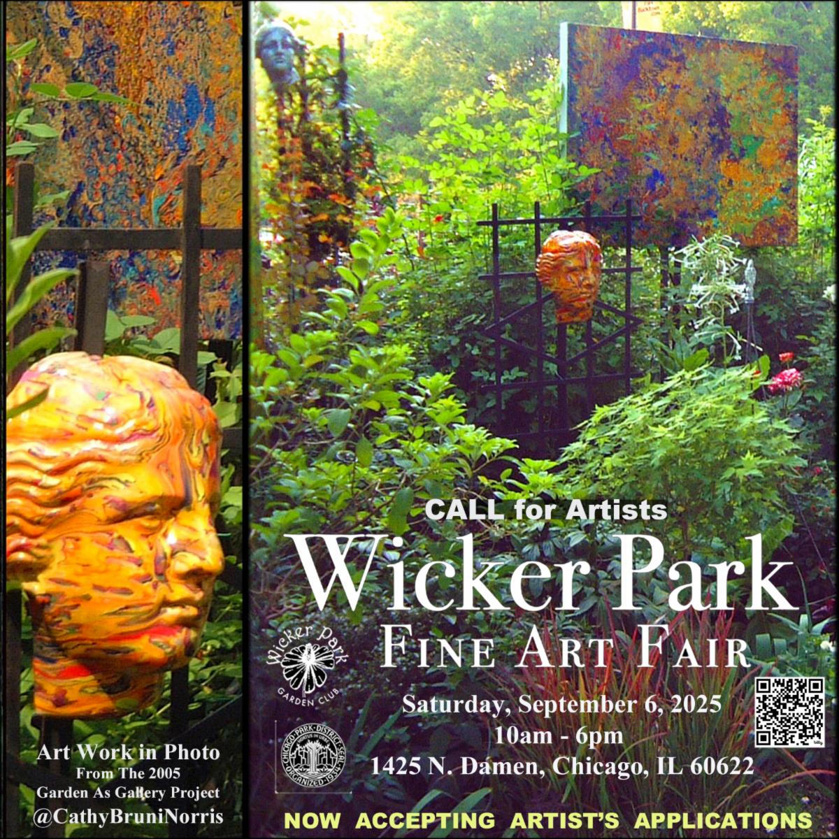 The Wicker Part Fine Art Fair will take place on Saturday, September 6, 2025 from 10-6 at the Wicker Park Community Gardens at 1425 N. Damen Ave. This event includes a curated group of fine artists displaying and selling their work, artworks installed in the gardens (The Garden As Gallery), performances of classical music, hands on family art workshops,