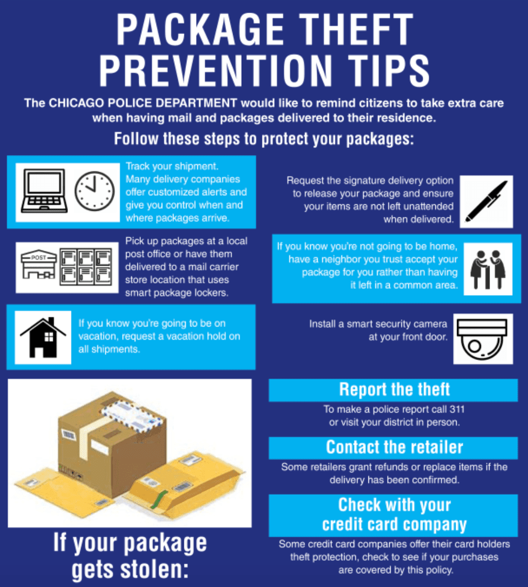 Packages: In past years, there have been thefts of packages that were left on porches. If you are receiving packages, make sure you have them sent to a location where you or someone you trust will be available to receive them (such as your office). If you are going to be out of town, make sure to arrange for someone to receive your package. You can also have them delivered to an Amazon or UPS locker.