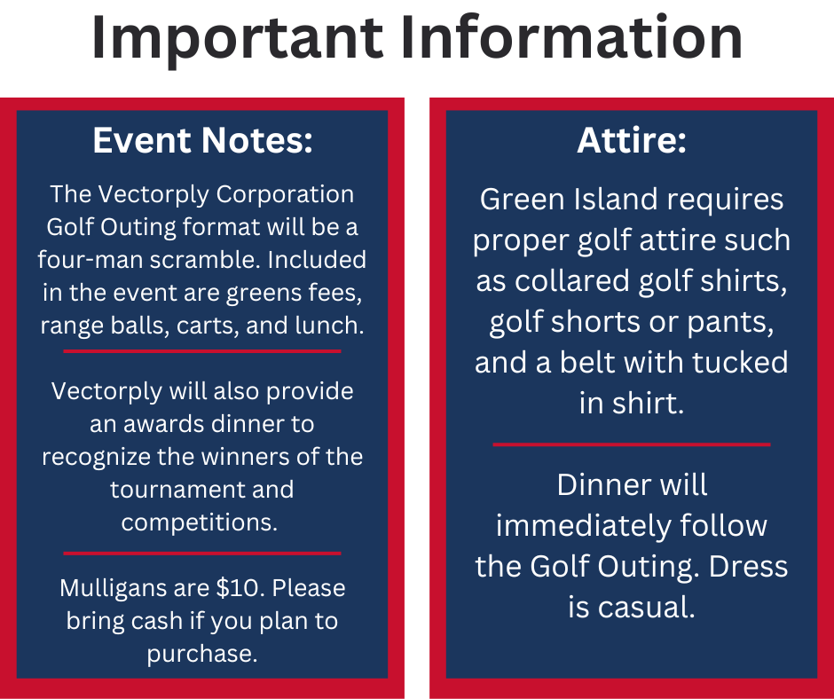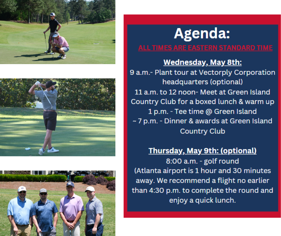 We are excited to extend this invitation to our 3rd Annual Golf Outing Wednesday, May 8th at Green Island Country Club in Columbus, GA. Please RSVP by Monday, April 1st for the Golf Outing and other events we have planned throughout the day. If you have any questions, please reach out to Jackie Elder at jelder@vectorply.com. |