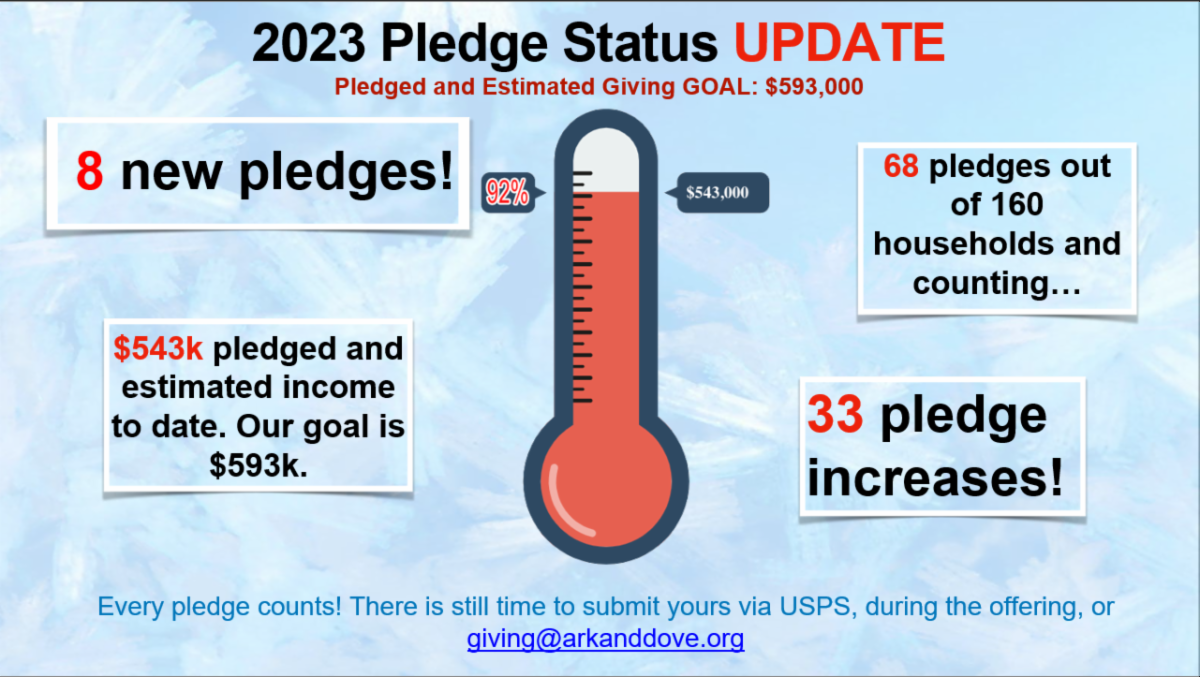 The 2022 Renewed Stewardship Team would like to sincerely thank everyone who has already submitted a pledge card for 2023. We are excited to share that 68 of 160 households have pledged so far and many have increased their pledges to help meet the needs of our church and community! If you have not submitted your pledge card to the church yet, either via USPS, in the offering plate, or giving@arkanddove.org, there is still time to do so! We are so grateful for your generous giving to support our mission and ministries at Ark and Dove.