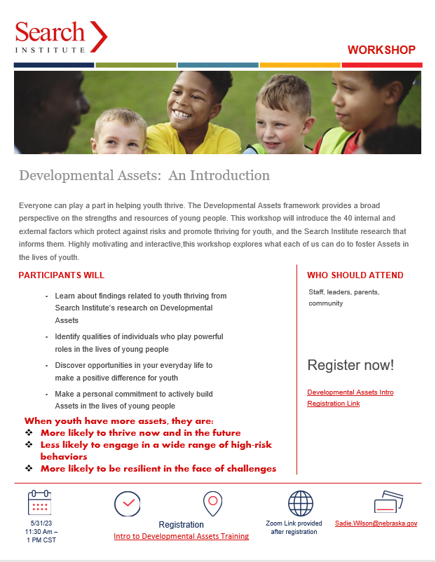 For those that attend this virtual event, there will be an option to attend a future two-day event which would enable you to train others in the Developmental Assets. There may be stipends available for this future two day event.