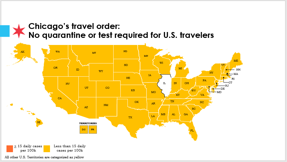 In response to the changing dynamics of COVID-19 transmission across the United States, and to support Chicago’s efforts to contain the spread of COVID-19, the City issued a Travel Order in July 2020, applicable to anyone coming into the City of Chicago from designated states with a significant degree of community-wide spread of COVID-19. Anyone traveling from a state on the Orange list was directed to obtain a negative COVID-19 test result no more than 72 hours prior to arrival in Chicago or quarantine for a 10-day period. For the first time since July 2020, as of June 1, 2021, no states are at the 15 cases per 100,000 residents threshold for the orange tier. Chicagoans are urged to delay travel until they are fully vaccinated.