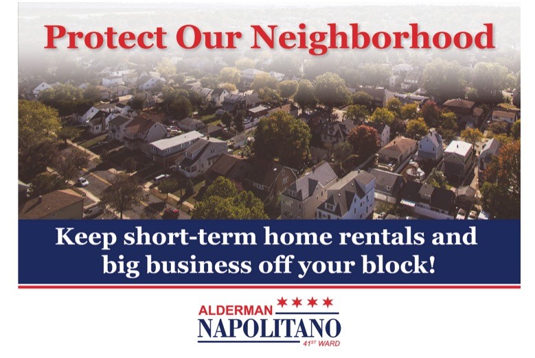 Neighborhoods throughout Chicago have been negatively affected by online, temporary home and room rentals. These online rentals are on the rise and may pose a threat to our community by facilitating pop-up parties and illegal activity. These "hotel-houses" may also have a negative impact on property values. The quality of life in our neighborhoods is paramount and we need your help banning these "hotel-houses" on your block and throughout the 41st Ward.