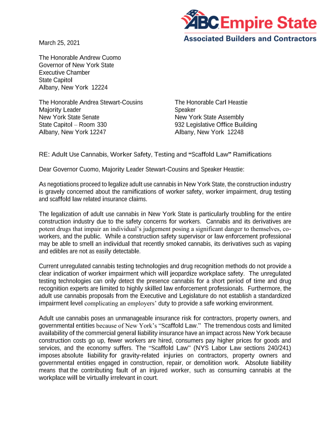 As negotiations proceed to legalize adult use cannabis in New York State, the construction industry is gravely concerned about the ramifications of worker safety, worker impairment, drug testing and scaffold law related insurance claims.