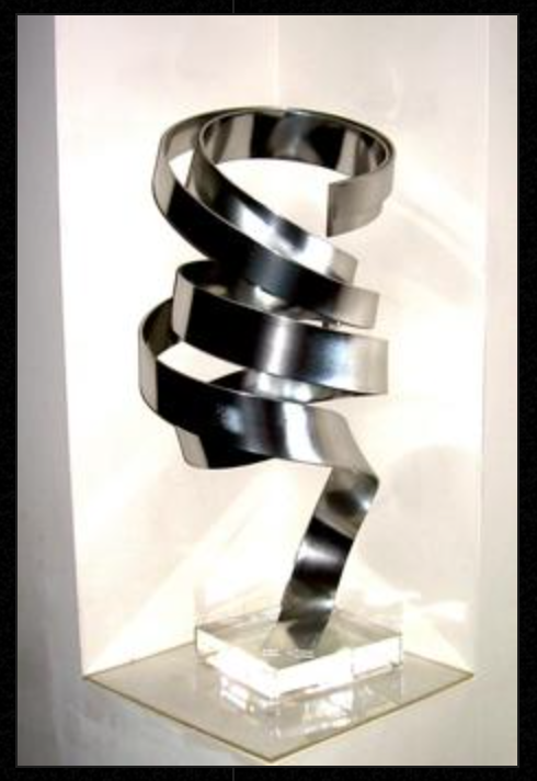 Metals - Dan Murphy from Chapel Hill, NC. Dan creates steel & aluminum sculptures, using equipment that they personally designed and made. Titles show the meaning of Dan's abstract work. The metal is sheered from sheets or extruded. Metal colors: gold, silver & more. Bases are cast acrylic or marble. This is Dan's 46th year as a full time sculptor.