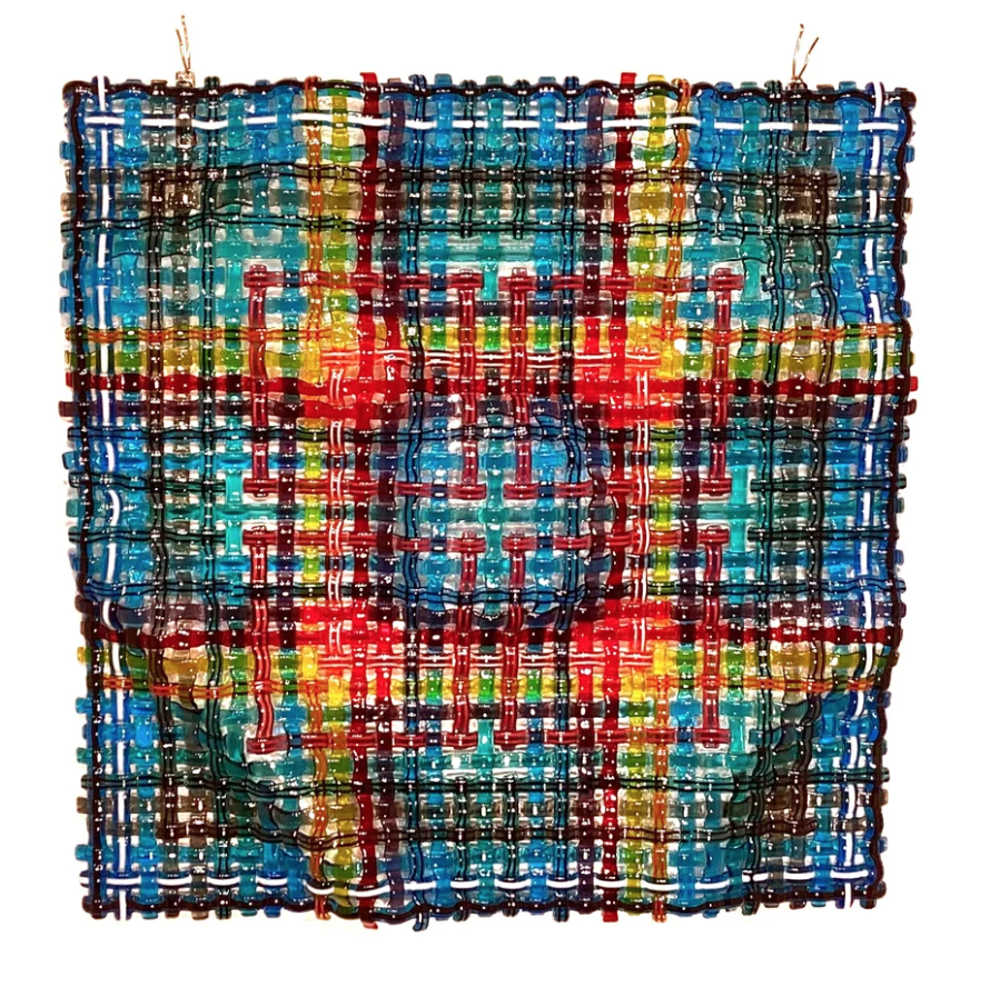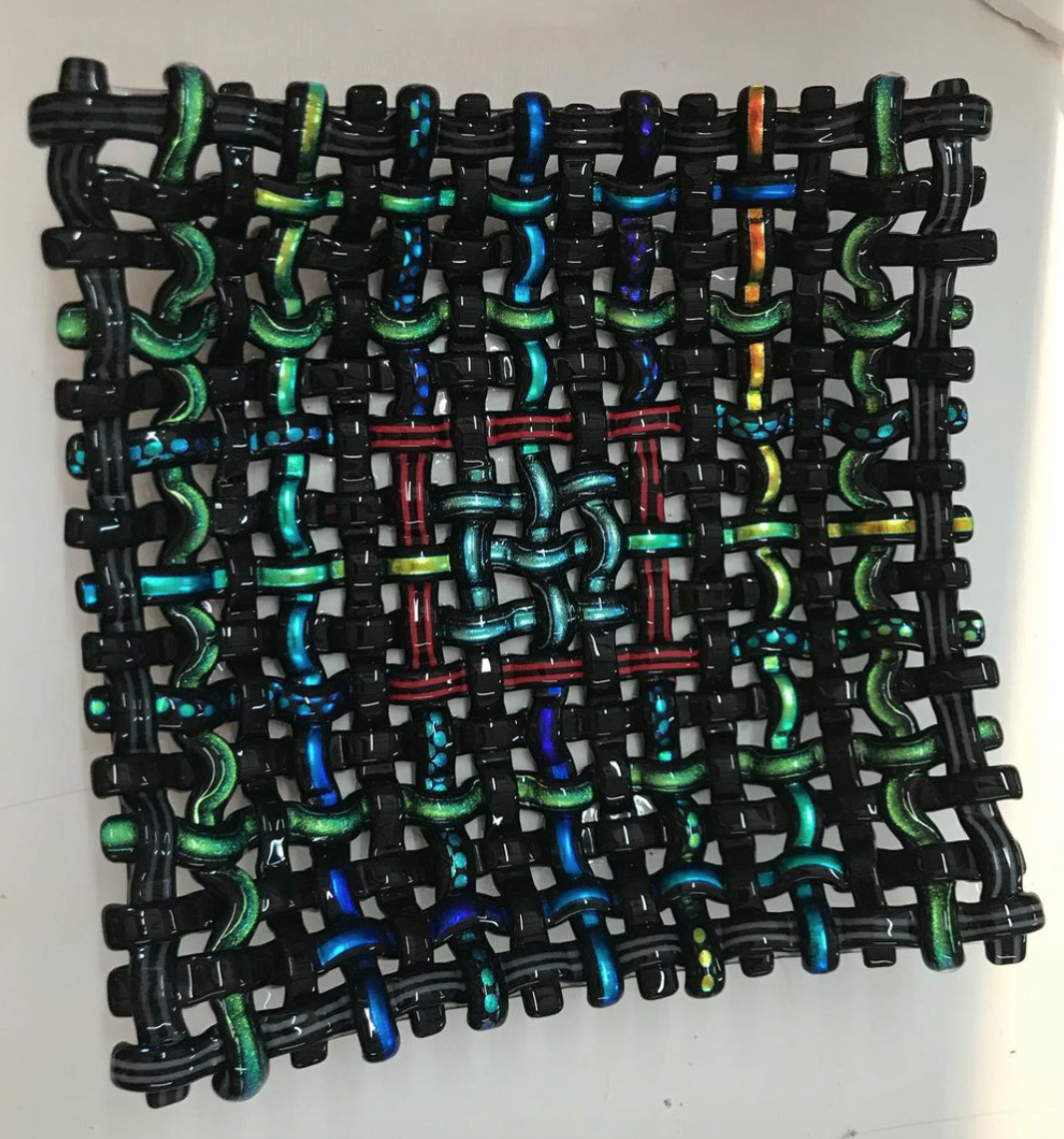 Larry Hamilton’s Artist Statement - Since 1979, glass has been the creative medium in my life. My disciplines within the medium have changed, from my early years doing stained glass in a Tiffany style, to briefly visiting a form of blown glass known as torch work. Around 1990, still enjoying the transfer of light through glass, I discovered my niche in fused glass. Being able to see a piece in my head and go on to create it has been a great joy to me. In 1991, while visiting the Corning Museum of Glass, I saw my first pieces of woven glass from an early 1900 display of period pieces. I became captivated by the pieces of woven glass. There was no relative material available on the process, so I felt like I was inventing the wheel. Trial and error became a way of life. After a few years of working on it part-time until the process and basic skills of weaving glass were accomplished, I then began using these skills in different artistic avenues. With the artistic edge wide open I’m constantly changing my direction. The latest look I’m working on is one I call candyland glass. It is a combination of bright colors and graphic designs that have a candy-like appeal and form into my own carpet pattern designs. In the finished art piece, the colors dance with the light. So after 35 yrs, I think I will be able to spend several more years exploring this phase and other deviations of woven glass.