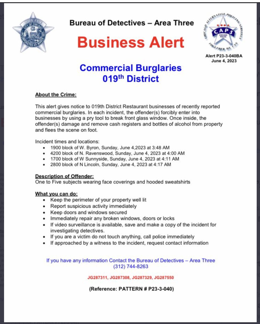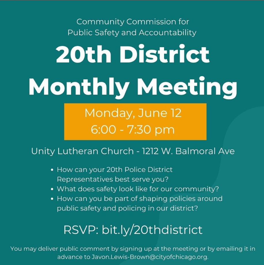 The 20th Police District Council is holding their second monthly meeting next Monday, June 12th, at 6PM at Unity Lutheran Church at 1212 W. Balmoral Ave. We encourage residents to attend the meeting and get involved in building a safer and more accountable community. You can RSVP here. | |