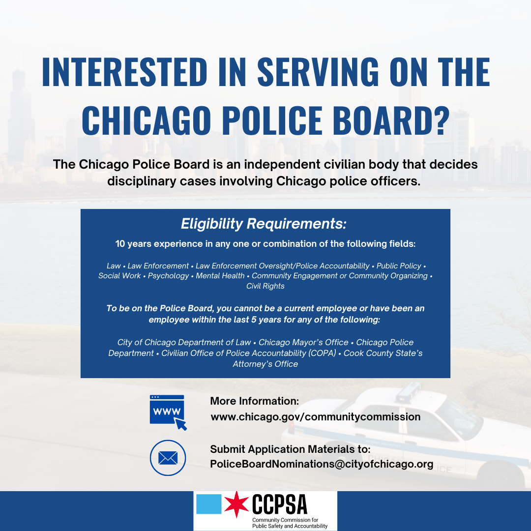 The Civilian Office of Police Accountability (COPA) has opened the application for its Community Advisory Council (CAC). CAC members will serve as an important communication conduit between COPA and the broader community. They will share their perspectives from the community about the ongoing work of COPA and provide input on COPA-related issues. Members will reflect a wide ranging of experiences and backgrounds, including faith-based organizations, police reformers, policy advocates, and others. Those interested in the issues of police reform, community service, and neighborhood advocacy may be interested in this position.