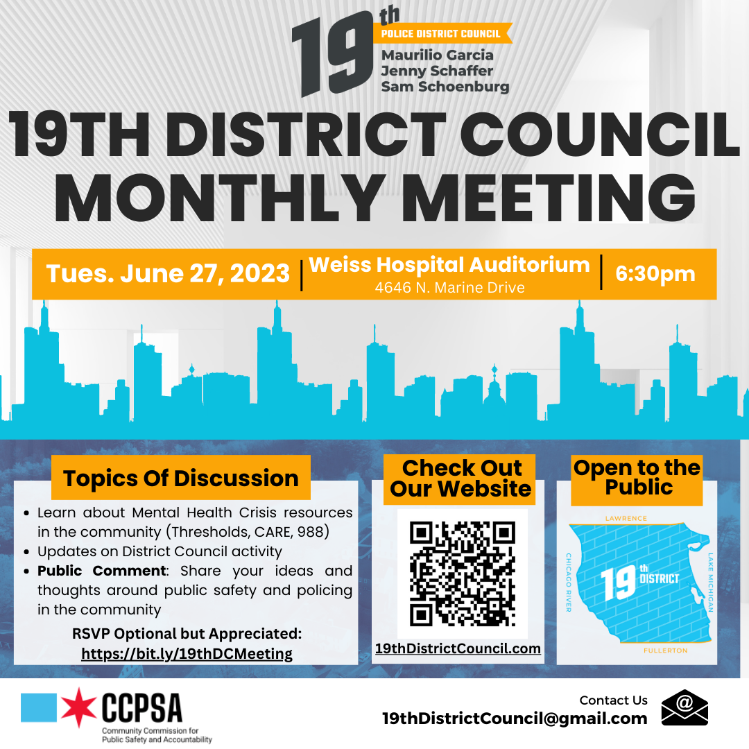The next 19th District Council meeting will be held at Weiss Hospital Auditorium on Tuesday, June 27th at 6:30PM at 4646 N. Marine Drive. Those interested in keeping in touch with the District Council Members and working together to keep our community safe can find more information at https://www.19thdistrictcouncil.com or contact them at 19thDistrictCouncil@gmail.com. | |