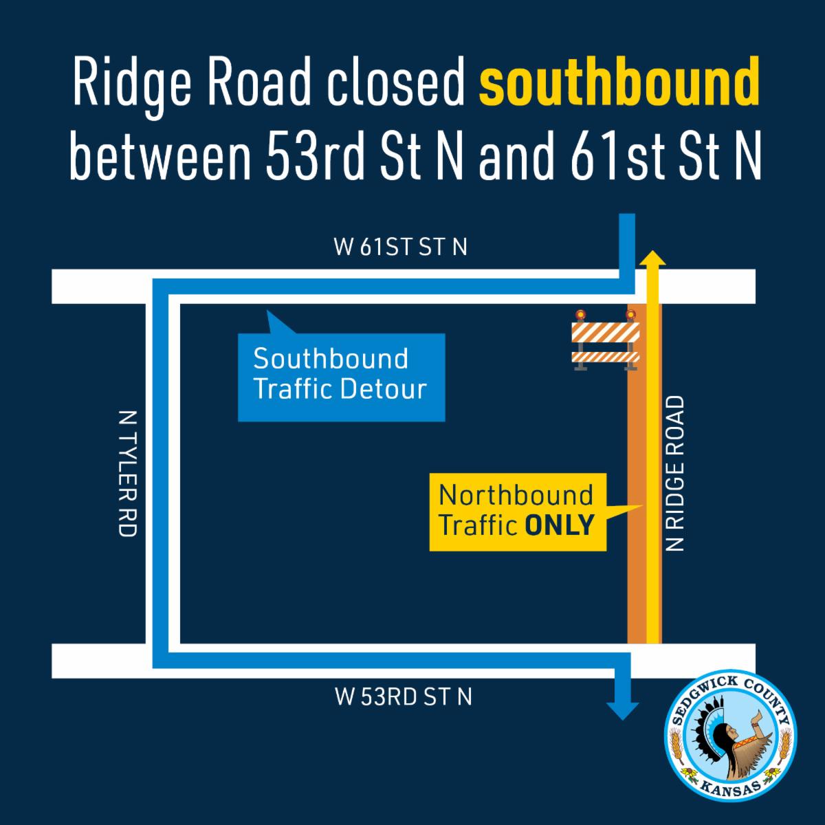 Only northbound traffic will be allowed on Ridge Road from 53rd to 61st Street North. Southbound traffic on Ridge Road will detour west at 61st Street North to Tyler Road. Drivers will then head south to 53rd Street and back east to Ridge Road. Signs are posted in the area to direct drivers. The detour will continue until the project’s completion by the end of June, weather permitting.