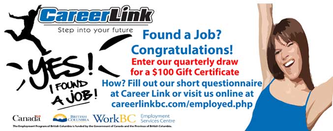 As a local WorkBC Employment Services Centre, Career Link provides free employment services to job seekers in Powell River with funding from the governments of BC and Canada. Career Link does not screen employers or applicants, and assumes no responsibility or liability for the job posting. Any arrangements are between the job seeker and the employer. Further details are available at www.careerlinkbc.com