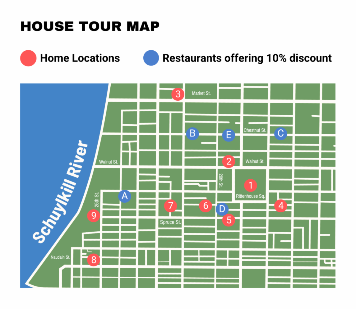 If you purchased your ticket online, arrive at Rittenhouse Square to pick up your ticket (wristband) and tour book. The tour book will have the exact locations of the properties.