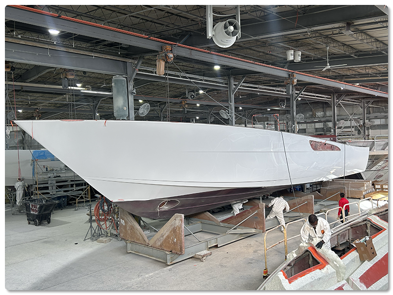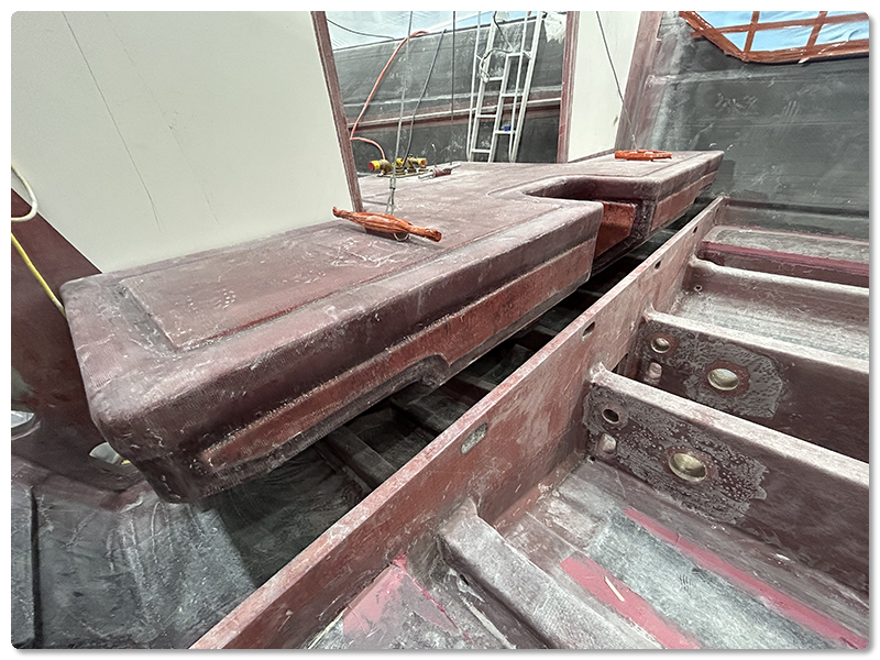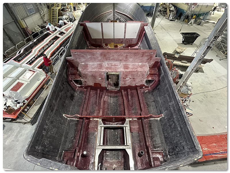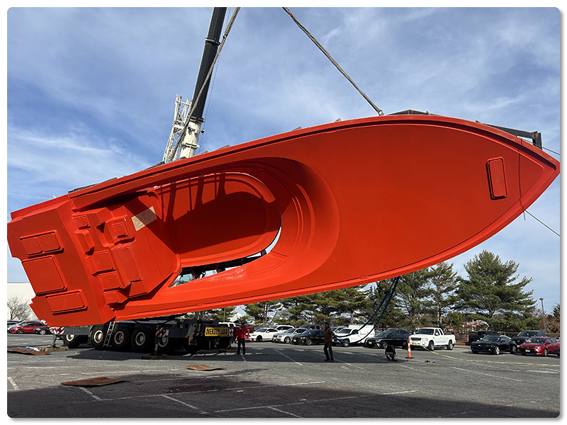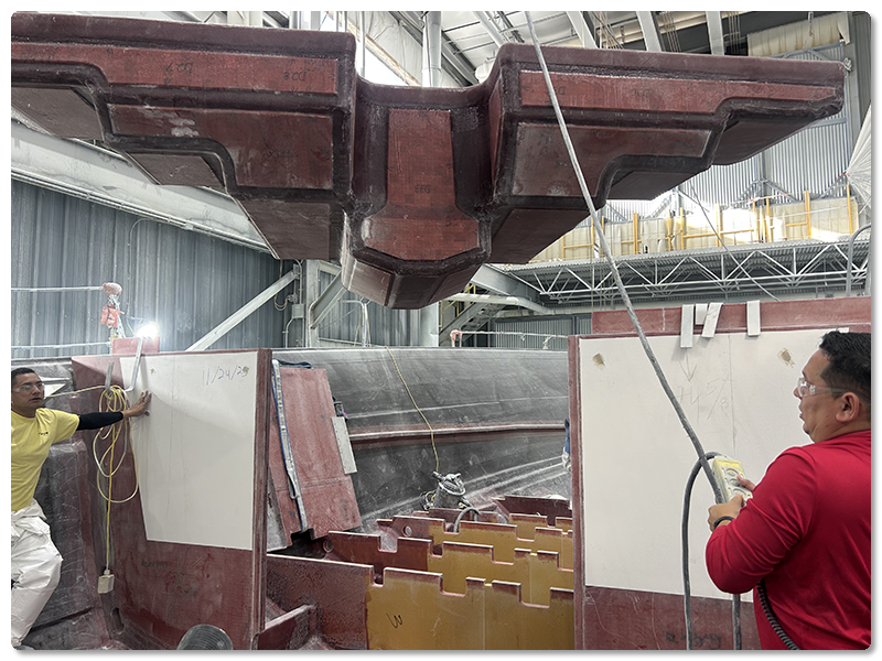 The deckhouse, foredeck and cockpit are formed as one integrated mold. Above: The mold has been separated from the plug and lifted clear, revealing the complete geometry of the house, deck and cockpit. You can see the cockpit hatch gutter details and the mezzanine. Also note the open areas, where the removable mold surfaces used to produce the windshield details will be installed. The mold now moves into R&D for surface prep before entering fiberglass for full construction. |