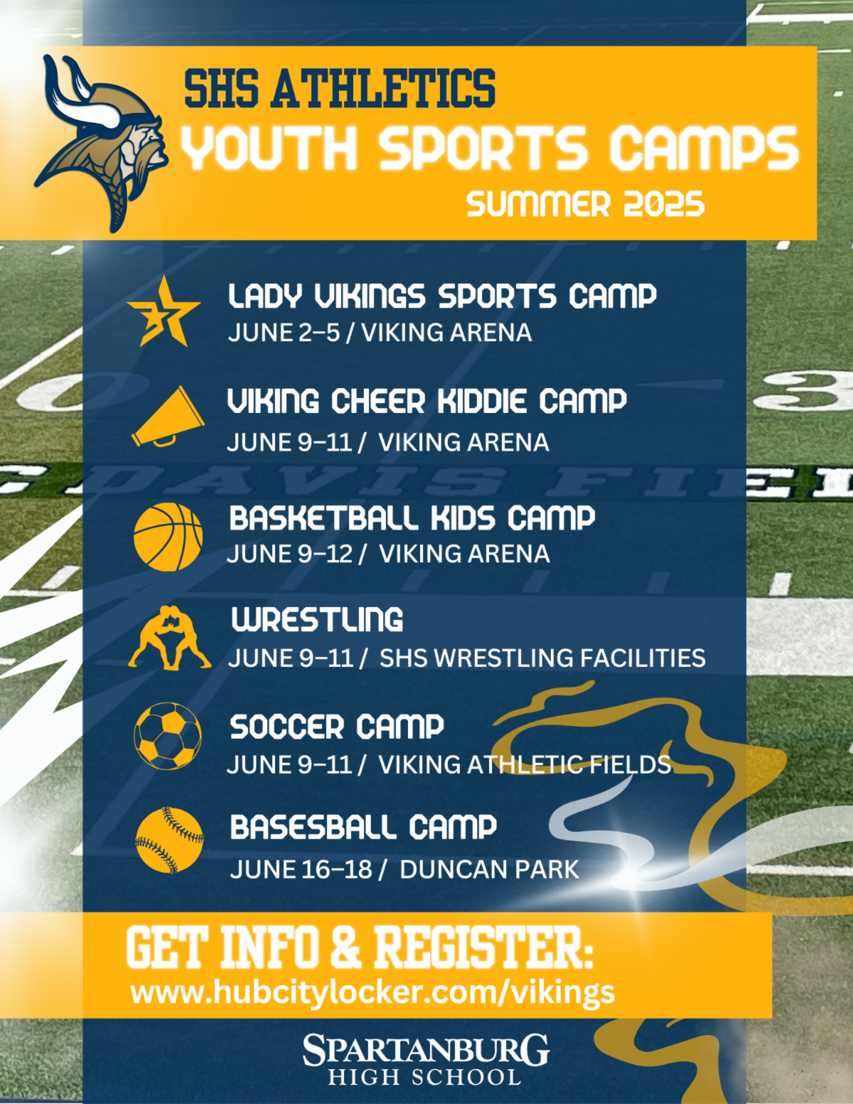 Locations include the Viking Arena, Viking Athletic Fields, Viking Wrestling Facilities and Duncan Park. Spots will fill fast—get more info and register now at: www.hubcitylocker.com/vikings