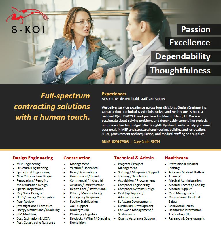 We continue to be recognized for our niche of "design, build, staff, and supply" as an attractive 8(a) EDWOSB contractor and teammate because of our consistent past performance, comprehensive capabilities, and strategic business development. Our people can be found on the frontlines supplying PPE for COVID-19 response and direct patient care to Wounded Warriors. We are working behind the scenes to manage electronic medical records and train personnel using advanced medical simulation. We design and build healthcare facilities, hospitals, colleges and academic institutions for the next generation. Our technical services extend to constructing the infrastructure needed to support the operations of NASA Kennedy Space Center and Cape Canaveral Space Force Station in the 21st Century.