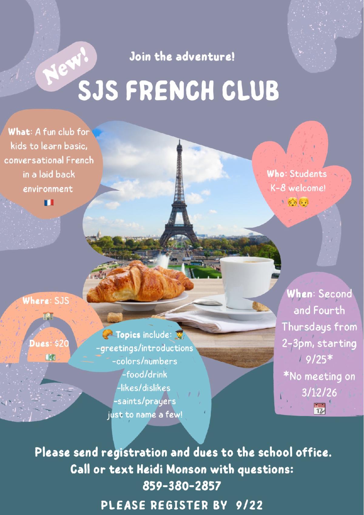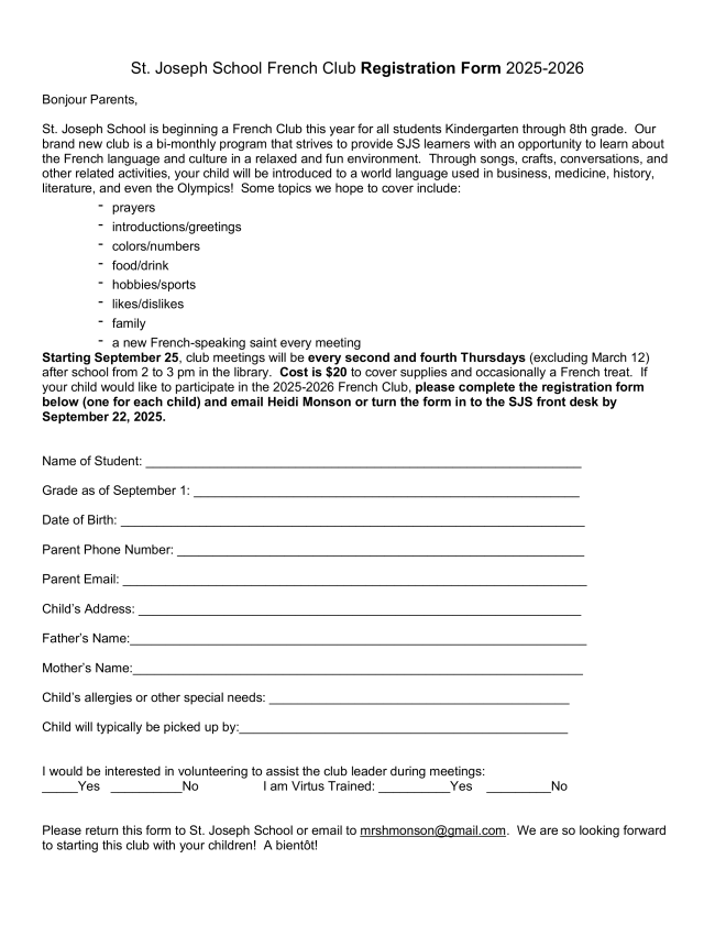 September 25 French Club 2:00-3:00 Grade K-8