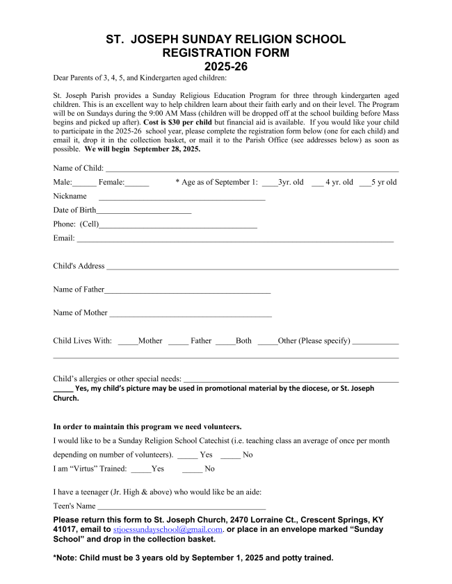 Sunday Religion School for 3,4, 5 and Kindergarten aged children will begin on Sunday, September 28. Classes take place during the 9:00 am Mass and are held during the school year. Please use the attached registration form to register your child, preferably by September 22. We are also looking for teachers and junior high/high school class aides. Contact Tina Klare for more information.
