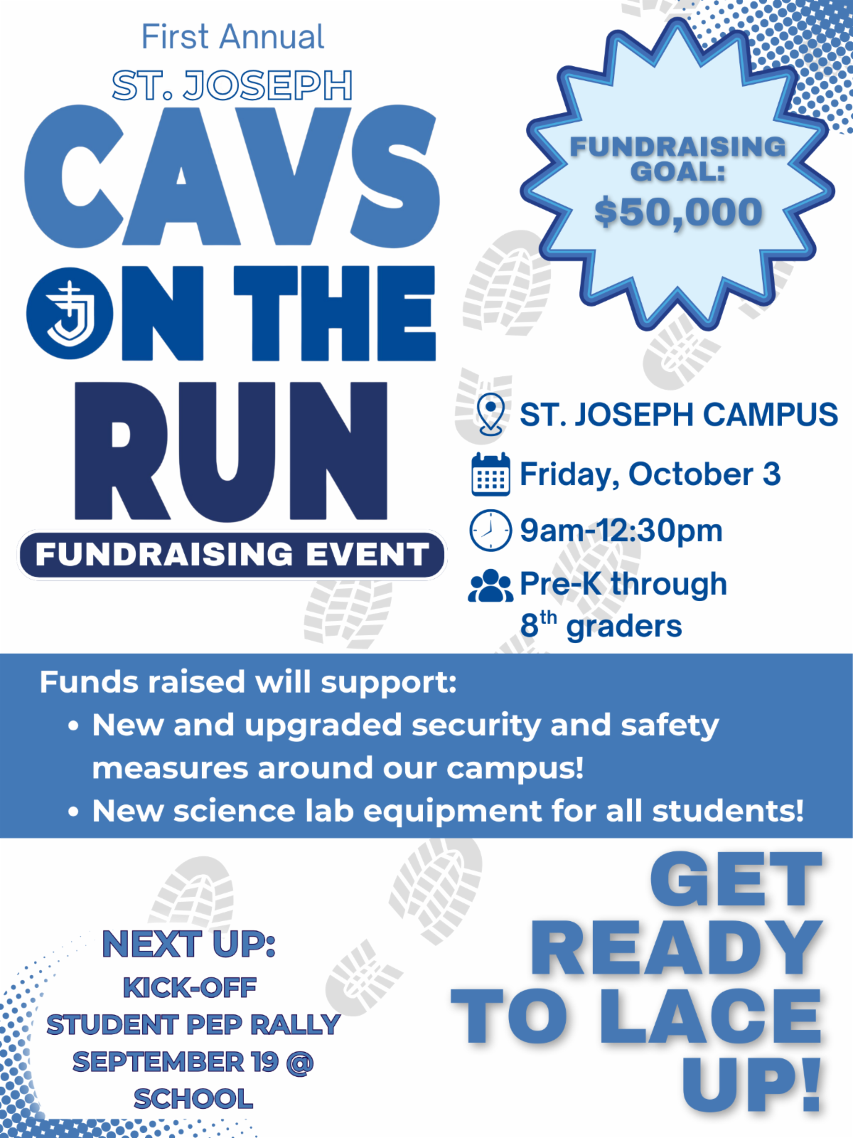 We're excited to announce our first annual Cavs On The Run fundraiser! Students will get to participate in our kick-off event, a pep rally Friday the 19th! Stay tuned for more information.