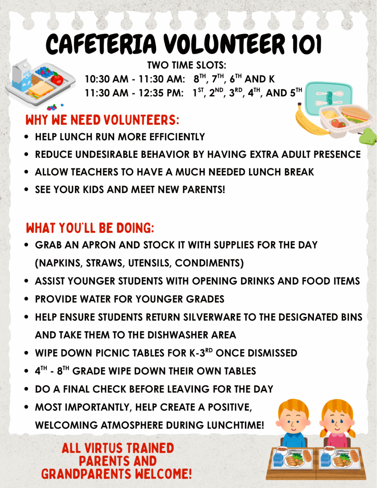 Please review the link below to volunteer in the cafeteria for the month of September. Check in at the school office by 10:30am. Make sure to wear athletic shoes or rubber soled shoes. No open toed shoes or flip flops. Also no younger siblings please. All volunteers must be VIRTUS trained. New this year: students will be using regular silverware instead of disposable. Please watch students so the silverware is not thrown in the trash. Thank you!
