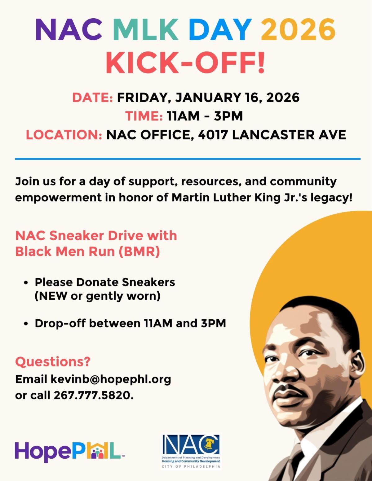Join HopePHL's Neighborhood Advisory Committee to kick off the MLK Weekend of Service on Friday, January 16 from 11am to 3pm at 4017 Lancaster Avenue.