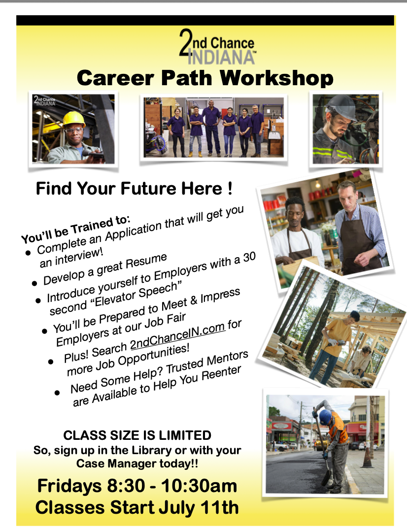 A work release facility is a first step in reentry that allows individuals to have the support of a place to live, with oversight and training as it serves as an off-ramp from incarceration. This July, a new service to IDOC will be provided by 2nd Chance Indiana that brings its Career Path Workshop to the men who live in the 350-bed Duvall Residential Center. The men will be trained in all the basics of completing job applications, developing a resume, and crafting a “30-second elevator speech” to help them describe their talents and overcome the difficulty of explaining past issues. They will go through a series of career assessment questionnaires to determine where their interests and talents lie, and mentors will be available for those who don’t have the needed support during reentry. Jobs are available on 2ndChanceIn.com, and with this training, most will succeed.