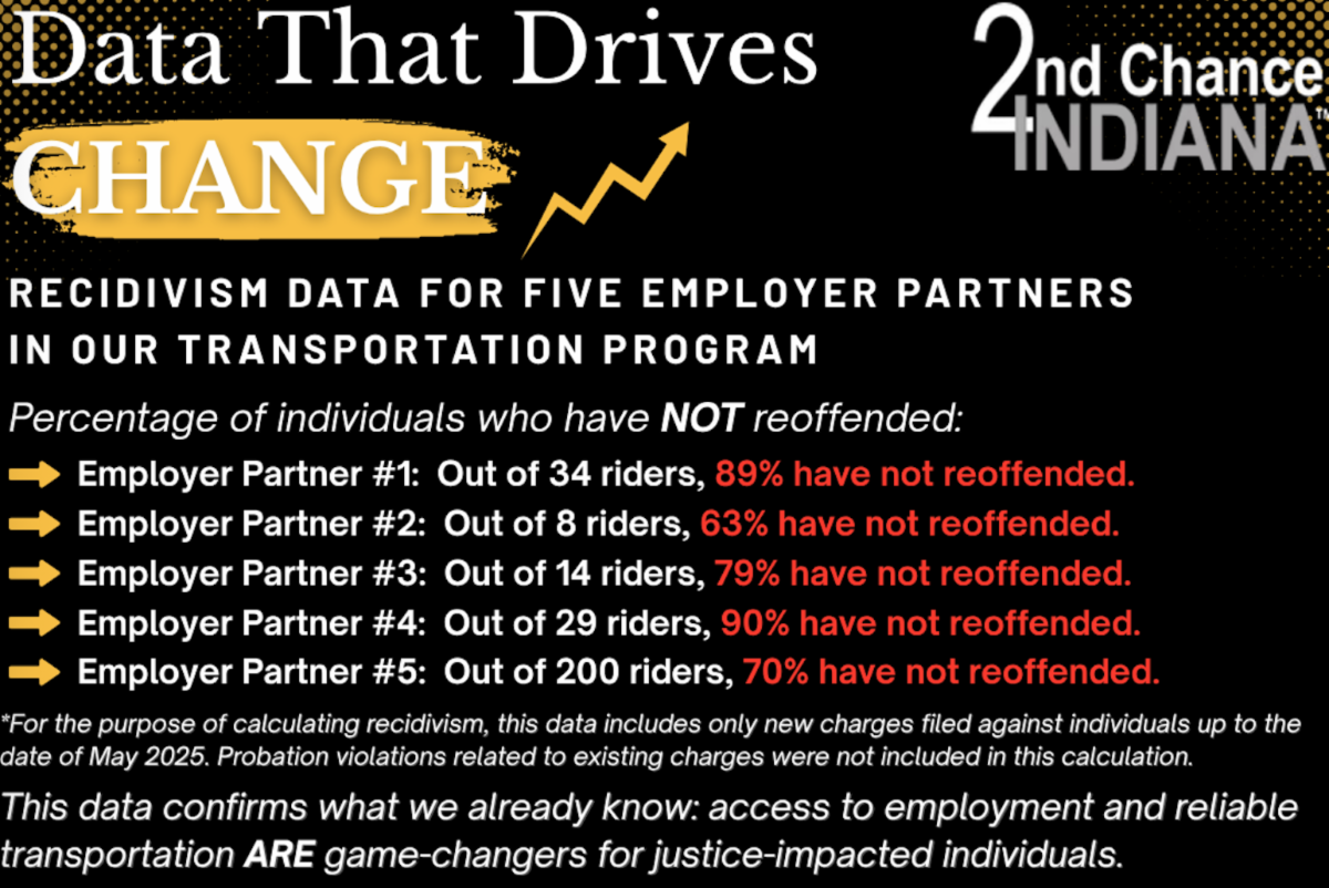 Data drives the decisions made at 2nd Chance Indiana. Now, our first available data points show actual recidivism for those who have had rides to and from work through the 2CI Van Program, that removes the No.1 barrier to getting and keeping a good job. Check out the red type: Out of 34 riders, 89% have not reoffended...out of 29 riders, 90% have not reoffended, and there is more to come. With the help of Martin Lammers, a retired Microsoft exec, we are developing data that can follow employee raises and promotions, in an aggregated form, so 2CI can integrate reentrant services that will support the more than 12,000 people with a criminal record who are released into Indiana each year. Van transportation works!