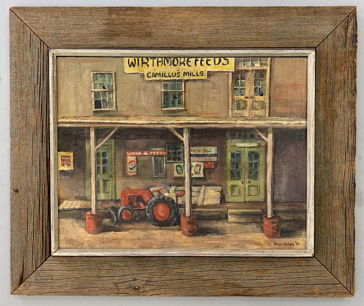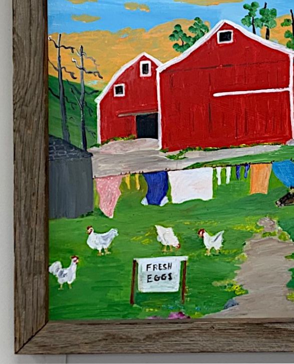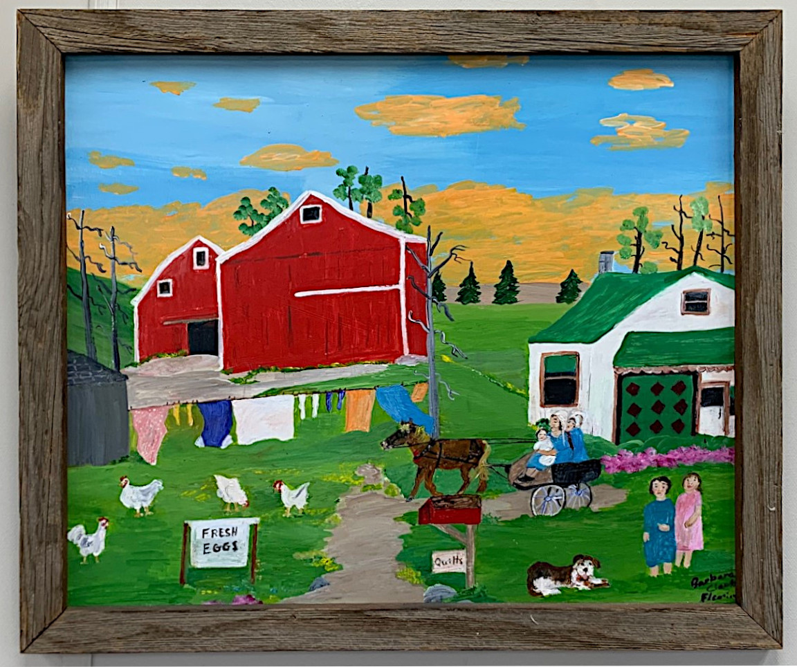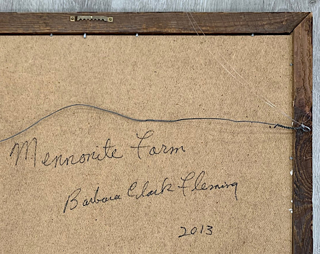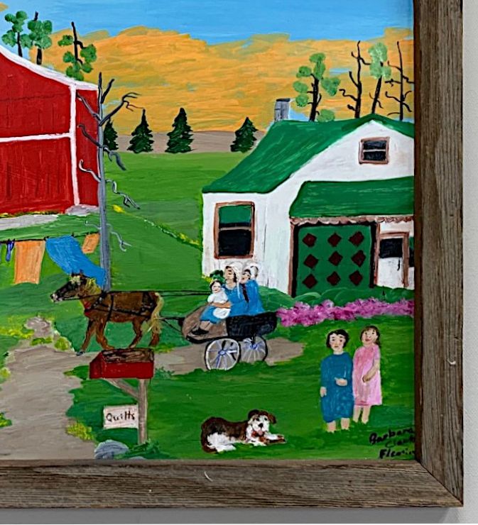 Nice primitive folk art painting by Barbara Clark Fleming (b. 1939). 26.25" x 22.5" framed. Signed front and back. Barbara’s work has been making a run in some big Canadian auctions . It is signed on the back " Mennonite Farm Barbara Clark Fleming 2013".